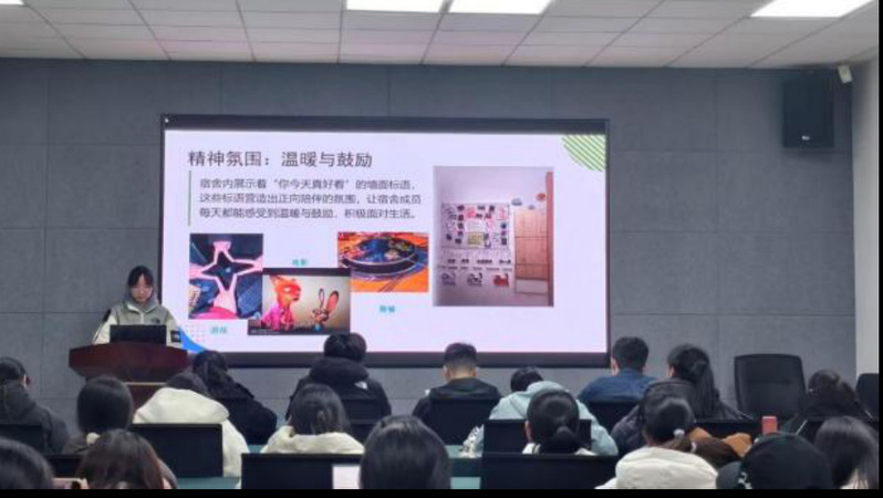 决赛共设三个环节。在答辩展示中,各宿舍代表依次上台,围绕美化理念、设计亮点、协作过程与活动感悟,通过精心制作的PPT,生动呈现了宿舍的独特风格与集体凝聚力。同学们的表达真挚动人,创意设计纷呈,充分彰显了商院学子积极的生活态度、和谐的宿舍氛围,以及出色的审美与实践能力。