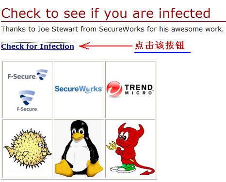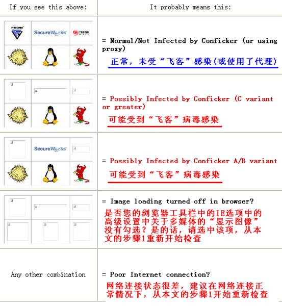 “飞客”蠕虫病毒的扫描与查杀步骤 (1) 登录http://www.confickerworkinggroup.org/wiki/网站 (2) 在打开的页面(如下)点击“Check for Infection” (3)在随后出现的画面上是否可以见到如下的画面,如画面有残缺,则表明你的机器很有可能已经感染了该病毒。 (4)根据下图出现画面的情况,我们做了简单的说明和建议,以便用户判断是属于那一种情况。 (5)如出现的画面是属于可能受到“飞客”病毒感染的情况。则用户可以链接下面的网站选择清除工具,或访问信息中心网站../下载该杀毒软件。用户可以自行选择使用。 清除工具网站: http://www.confickerworkinggroup.org/wiki/pmwiki.php/ANY/RepairTools 根据该网页中的杀毒工具选择链接下载。如用户遇到问题或不清楚的地方,请拨打7582咨询。 信息中心 2011年10月9日