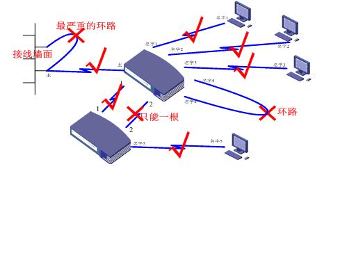 关于工商馆发生网络故障的情况通报 到达现场后,发现部分电脑还在蓝屏。而没有蓝屏的电脑无法获取到IP地址,手动设置静态IP地址也不能访问校园网。于是在商学院的老师陪同下一起到网络设备机房进行检查,最终确定为第二台交换机所连接的314房间的两个端口存在问题,拔掉314房间的网线后,该栋楼所有网络恢复正常。 在工商馆314房间,工作人员发现的确有一根蓝色的网线两端同时接在墙面的端口上,形成环路。现场拍摄的照片如下: 到此,工商馆此次网络故障的原因最终确定为,由于人为将网线两端接入网络造成环路,导致网络中断,根据学校有关规定,信息中心将对该网络端口暂时封闭,并进一步调查,请相关人员及时到信息中心说明情况。 特别提醒: 类似的网络连接环路的影响特别严重,轻则引起网络阻塞,重则有可能损坏网络设备,犹如电力系统中的短路。请各位老师和同学正确使用网络,在自行连接网线时尤其需要注意。避免示意图中不正确的接法: