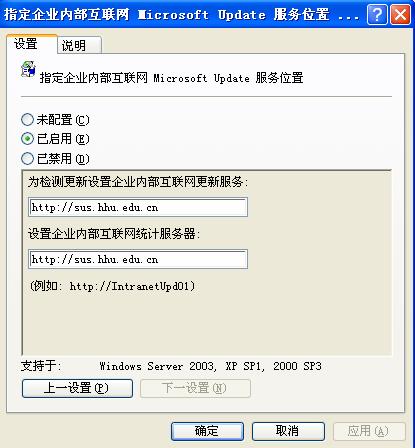 SUS客户端使用指南 SUS的功能介绍: 开云电竞网的SUS服务器是一个相当于 window updates 的服务器. 使用开云电竞网内部局域网WindowsUpdate自动更新服务,可以更快速、更安全地进行系统更新,同时可以节省你的网络流量。您的计算机将周期性(每天一次)连接到校内的更新服务器,检查是否有更新发布并自动下载,自动安装,可以省去自己去微软的网站 更新。 原有系统的要求: Windows 2000 Professional with Service Pack (SP) 2 Windows Server 2003 family 不符合那个要求的要先去 microsoft 官方网站自己去更新,使其满足要求。 注:如果你的系统不是正版的操作系统,升级后出现的一切问题不予负责。 Window 2000 ,2003 ,xp 客户端配置方法 1、鼠标左键点击桌面左下的菜单项 [ 开始 ] ,之后点击 [ 运行 ] 。 2、输入 [GPEDIT.msc] 并执行,以开启组策略设定界面。 3、在 [ 计算机配置 ] 项的所属中,右键点击 [ 管理模板 ] 。(参见下图)在弹出菜单点击 [ 添加 / 删除模板 ] 。 4、点击弹出设定界面中的 [ 添加 ] 。 5、 选中策略模板中的 [ WUAU.adm ] 策略文件。 点击 [ 打开 ] 。 6、在成功引导 wuau.adm 文件后点击 [ 关闭 ] 。 7、在组策略设定界面,展开并选中 [ 计算机配置 ] 项所属的 [ 管理模板 ] 项所属 [Windows 组件 ] 项所属的 [Windows Update] 选项。在组策略设定界面 [Windows Update] 项的右侧详细部,选中 [ 配置自动更新 ] ,之后右键弹出菜单 , 点击设定界面中的 [ 属性 ] 。(参见下图) 8、将 [ 配置自动更新 ] 策略部分中的属性设定为 [ 启用 ] 状态, [ 配置自动更新 ] 的模式设定推荐为缺省模式 3 (自动下载并提醒安装模式),选择一个你想自动更新的时间按排,并点击[ 下一策略 ]。(参见下图) 9、将 [ 指定 Intranet Microsoft 更新服务模式 ] 策略部分中的属性设定为 [ 启用 ] 状态, [ 设置检测更新的 intranet 更新服务: ] 和 [ 设置 intranet 统计服务器: ] 的设定全部为 http://sus.hhu.edu.cn 10、对于window xp 系统有两项配置,window 2000 或 window 2003 的有四项配置,主要配置这两项就可以了。 11、设置完了以后: 鼠标左键点击桌面左下的菜单项 [ 开始 ] ,之后点击 [ 运行 ] 。 输入 [SERVICES.msc] 并执行,以开启服务设定界面。 请确认 [Automatic Updates] 服务已经启动,且启动类型为 [ 自动 ] 。 请确认 [Background Intelligent Transfer Service] 服务已经启动。 12、这样就完毕了,你的系统会在你设定的时间自动到服务器上下载你系统需要的更新包,由于用户比较多,有时可以在你设定的时间内不能自动下载,这是正常的问题。 13、如果想还原到以前的状态,只要在第“7“步那里,把所有的配置改成“未配置“,这样就可以从Microsoft更新。
