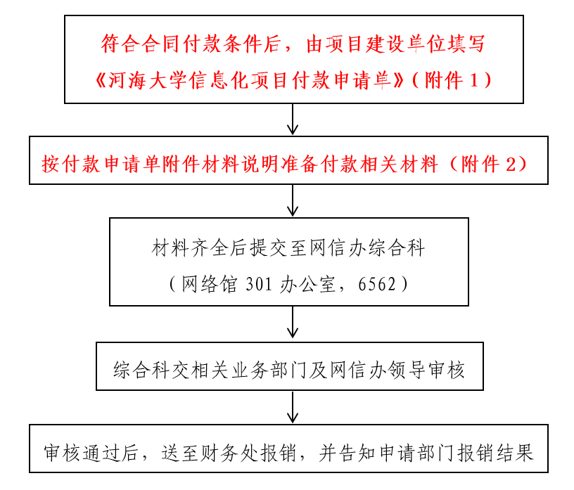根据学校财务报销规定要求,为提高工作效率,网络安全与信息化办公室(以下简称“网信办”)对信息化建设中的项目付款流程和材料要求做出规范,该规范适用于学校信息化专项经费支持的项目,具体流程和要求如图所示: