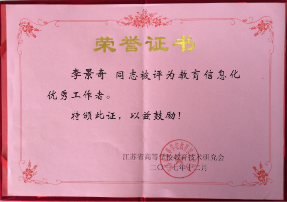 “大数据支持下智慧学习理论与实践研讨会”暨2017年江苏省高等学校教育技术研究会年会于2017年12月17—19日在南通大学召开,此次会议重点研讨智慧学习理论、实践及其对促进人才培养、教学模式创新的作用等内容,并表彰了2017年度研究会教育信息化工作先进集体及优秀工作者,我校李景奇老师获得“教育信息化优秀工作者”荣誉称号。