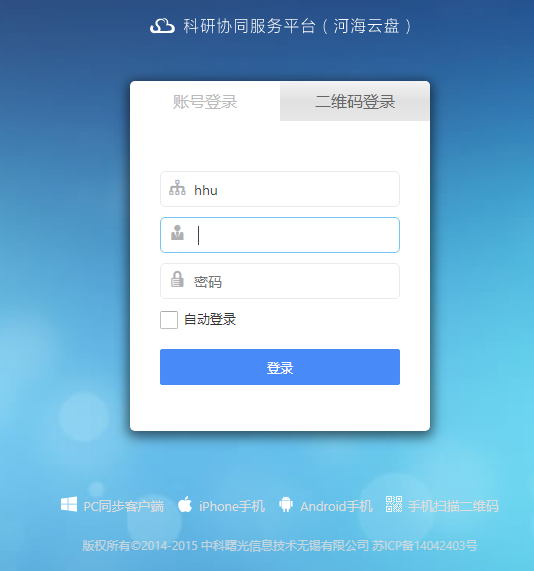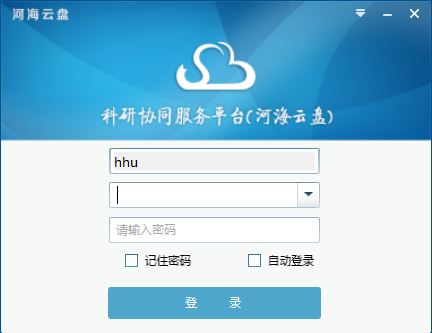 WEB浏览器登录:用户通过直接访问域名:yunpan.hhu.edu.cn,出现以下界面,输入系统默认域名:hhu,输入信息门户用户名、密码后点击登录可登录到系统。