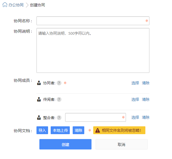 协同创建人创建新协同项目时,确定协同人员,指定整合者,传阅者是可选项,然后将协同文档导入。协同者根据要求,完成相应文档内容,提交后交整合者。整合者将所有提交文档进行汇编。