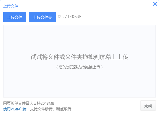 直接拖拽上传:web界面点击显示“上传文件”对话框,如下图,直接将文件或文件夹拖入却可。PC客户端能够实现拖拽方式上传和下载。
