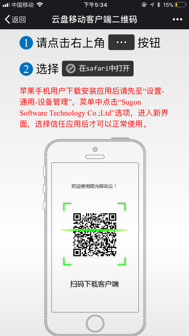 iPhone手机:鼠标点击下载iOS客户端,然后用苹果手机扫描二维码直接下载客户端安装。特别提醒,本客户端为企业认证方式,客户端不在应用商店下载。另外苹果手机还需要设置该软件为信任应用,具体设置方式如下图所示: