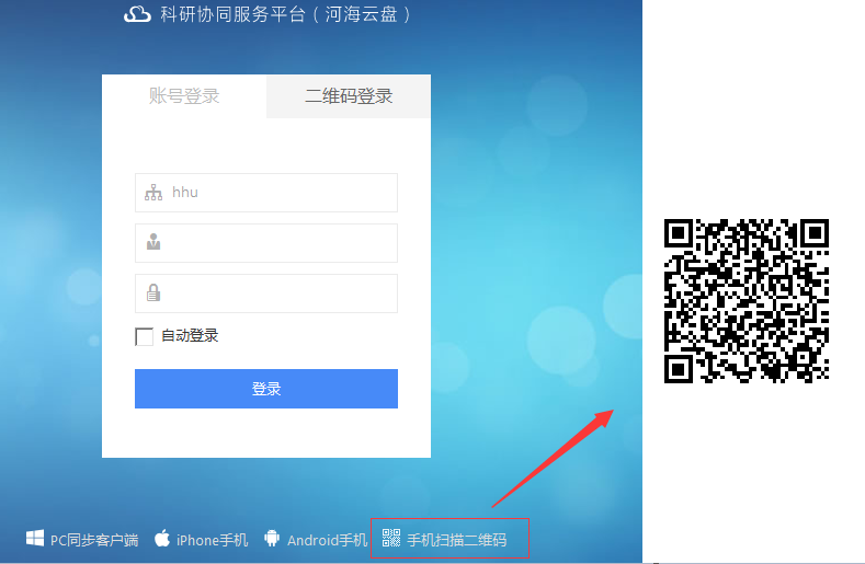Android手机:手机登录yunpan.hhu.edu.cn,点击下载Android客户端,可以直接在手机中安装云盘客户端。