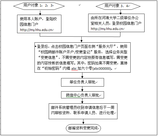 4、邮件账户变更信息时,不需变更的内容按原有信息填写,需变更的内容按新的信息填写。其中,密码如果不需变更,直接在“初始密码”内填abc加六个零(abc000000)。