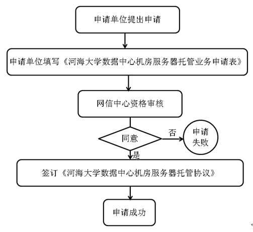 根据学校信息规范化要求,为规范我校数据中心服务器托管服务,充分、合理、有效地使用好数据中心资源,方便各单位服务器托管的申请,网信中心对信息化建设中的数据中心机房服务器托管流程做出规范,具体申请流程如下所示: