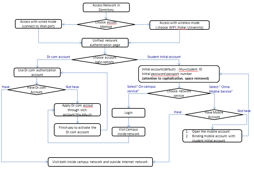First, every student has a initial account for campus network, which is hhu+ student ID (attention to capitalization)(for example: one student’s ID is D2020001, then his or her initial network account is hhuD2020001). And the password of initial account is the last 6 numbers of his ID card number or passport number(attention to capitalization, space removed).