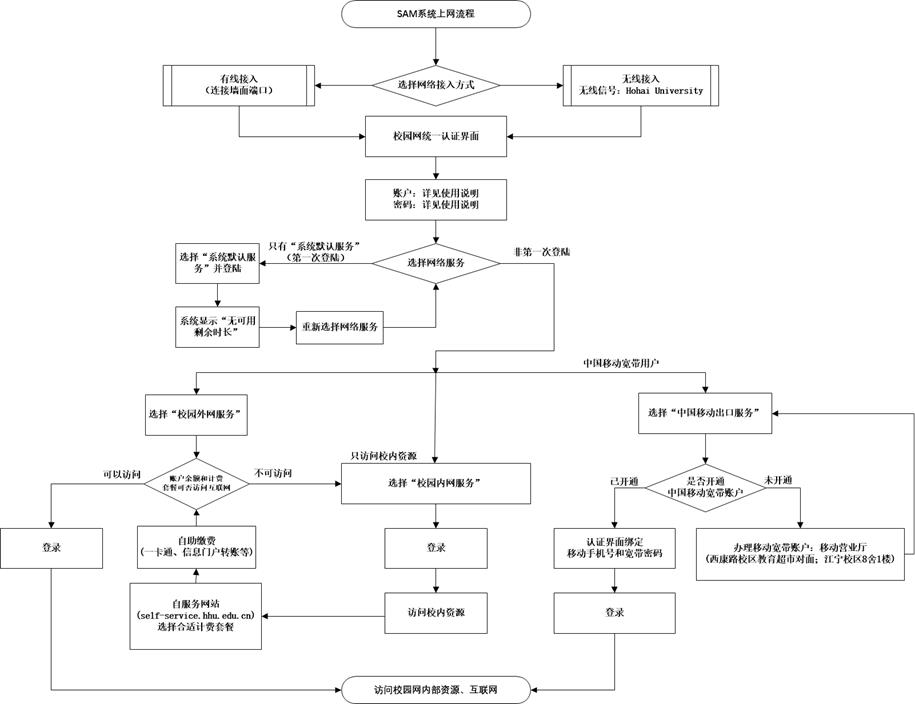访问“校园外网服务”时,使用SAM系统账户,计费策略在SAM系统的自服务系统(http://self-service.hhu.edu.cn)中变更;访问“中国移动出口服务”时,计费策略与移动宽带账户使用的计费套餐有关。
