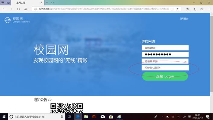 注意:第一次登录SAM认证系统时,登录页面的“请选择服务”状态栏里只有“系统默认服务”,登录成功后,即可访问校园网内部网络资源。再次登录,便可以选择上网服务类型。