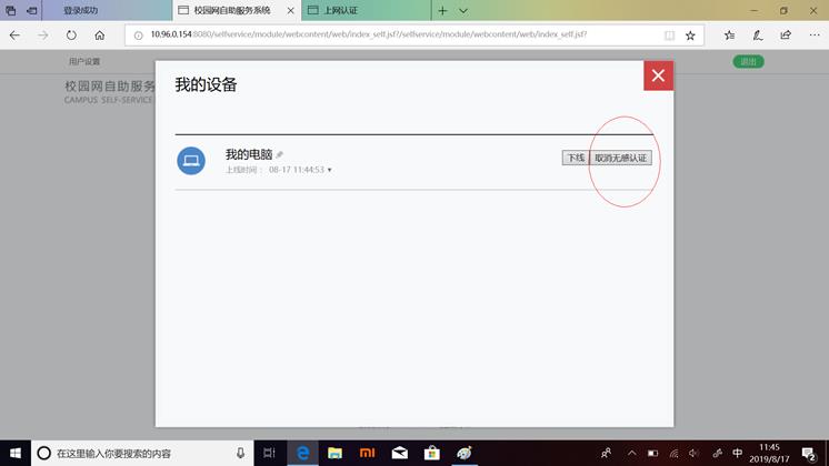 用户登录自服务页面(http://self-service.hhu.edu.cn),在“我的设备”下“取消无感认证”。