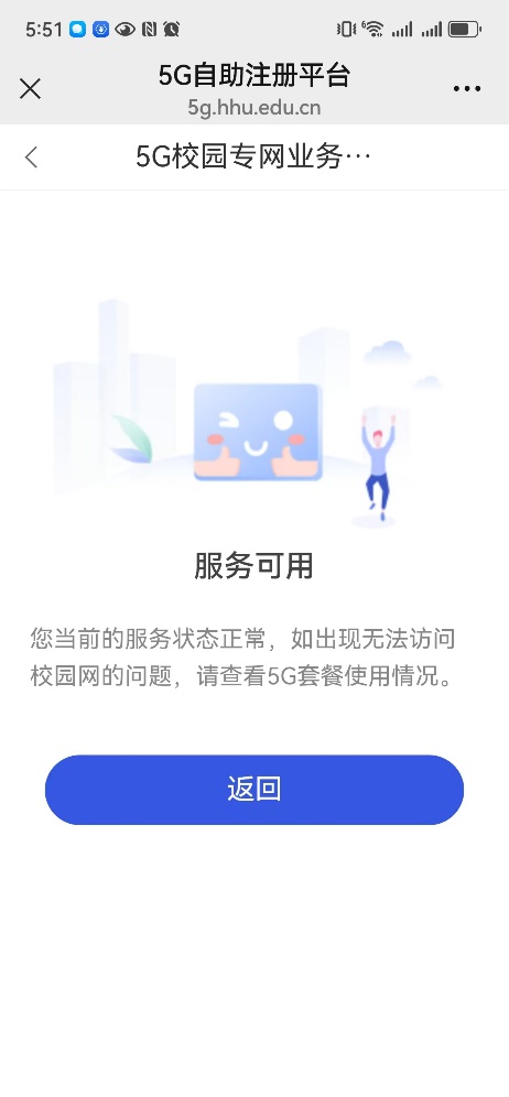 提交申请后,返回身份中台首页,选择“服务查询”功能查询服务状态。如运营商端和学校端均开通成功,5G终端通过重启或者开关飞行模式一次即可使用专网,用户可通过访问https://test.hhu.edu.cn进行测试。