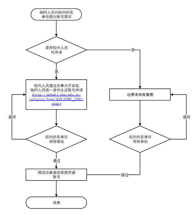 服务内容 | 为校外临时人员申请校内统一身份认证账号,并根据工作需要,选择是否开通信息门户、VPN、校园网等应用的权限。 |
