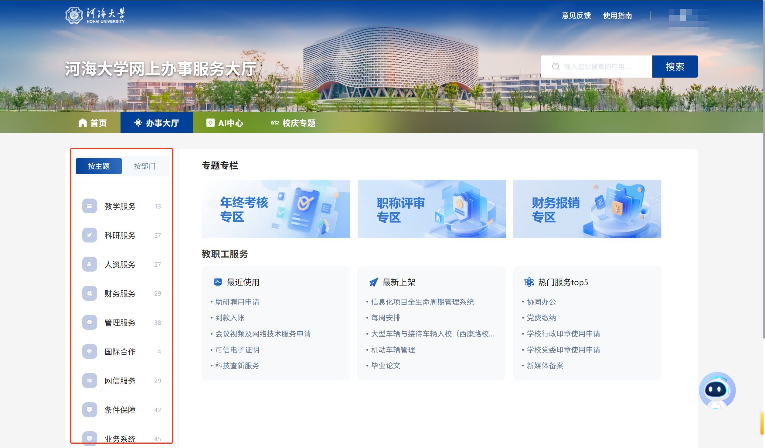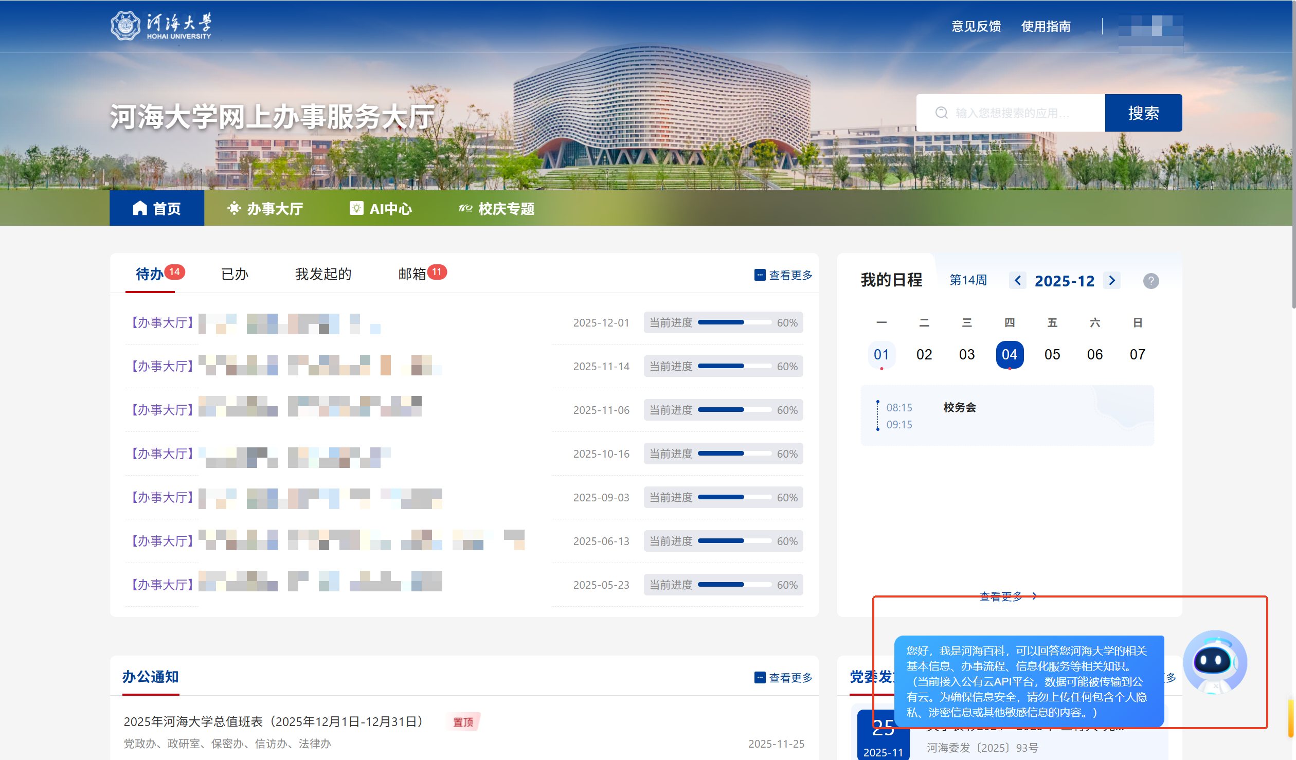 Tips1:AI中心对话式办事:通过和河海百科对话,了解办事流程和快捷定位办事应用。