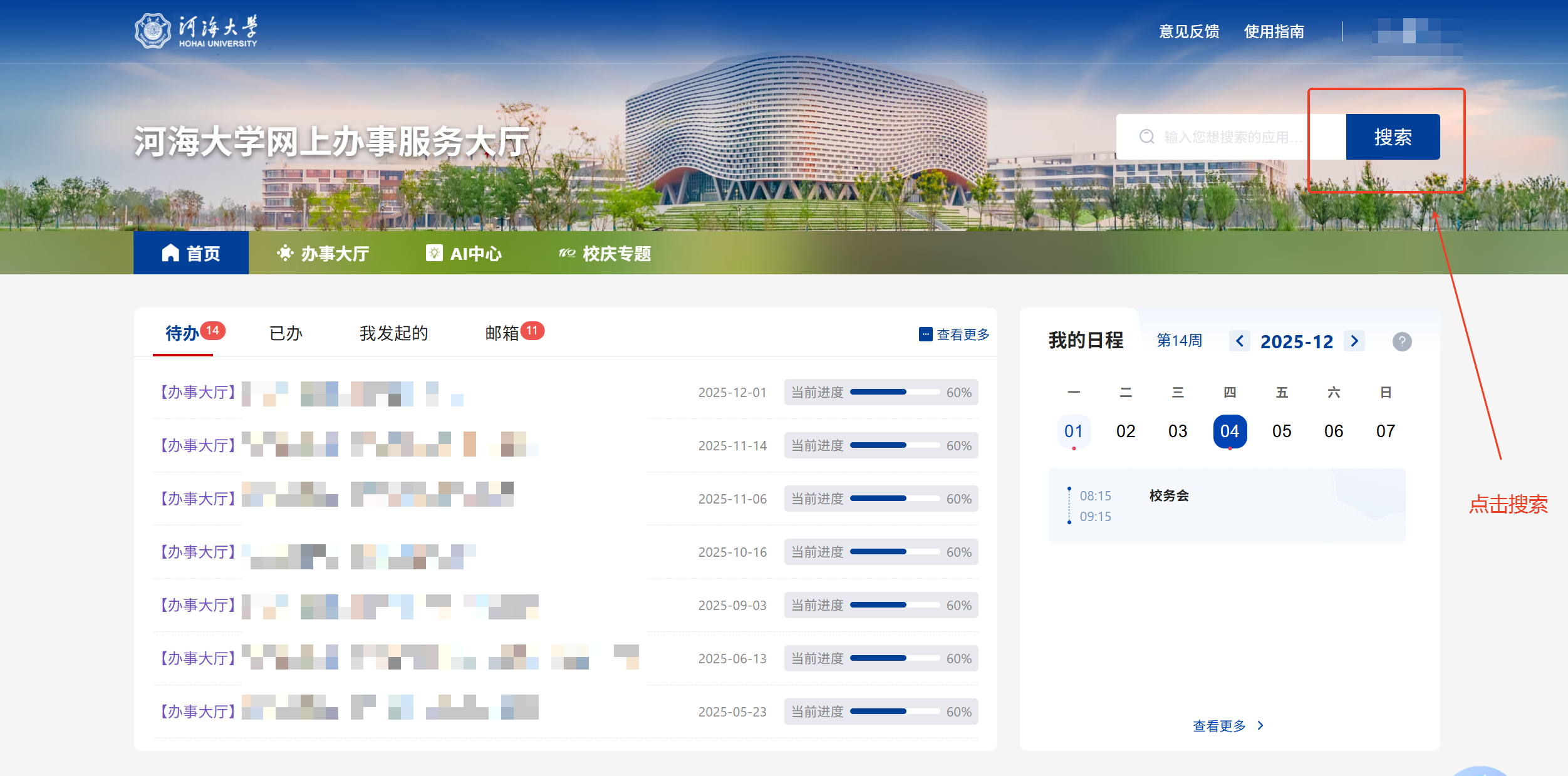 Tips2:全域搜索快捷办事:点击办事大厅右上角搜索,根据关键字全域搜索应用办事。
