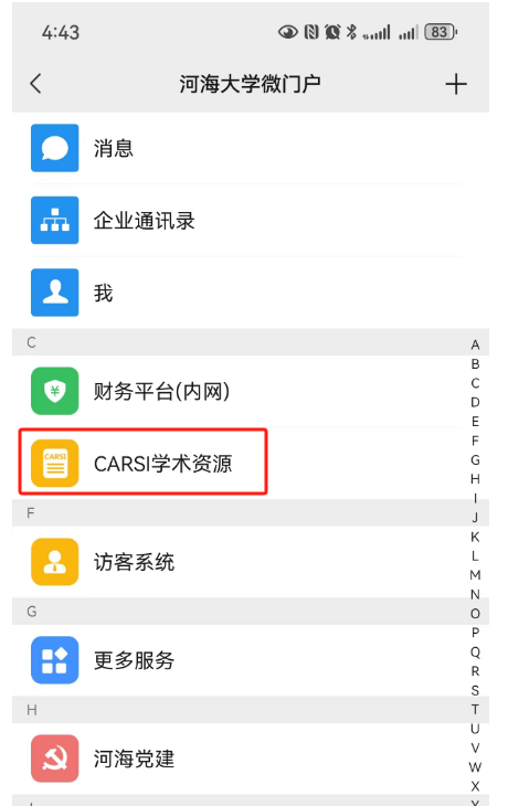2.微信访问开云电竞网微门户,点击“CARSI学术资源”,即可访问。