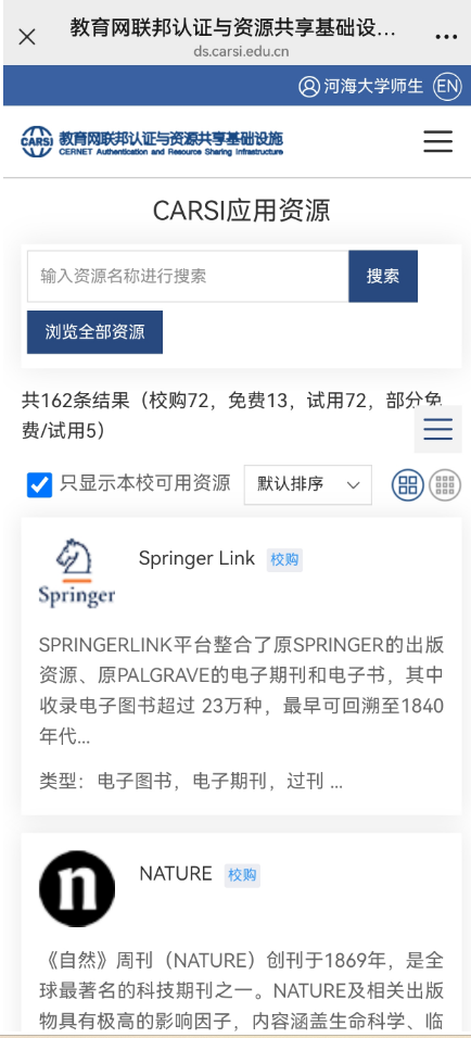 我校于2021起即成为CARSI联盟会员,并于近期完成CARSI的升级测试,现已正式上线,推荐师生可通过我校部署的CARSI认证系统访问各类图书文献等共享资源。