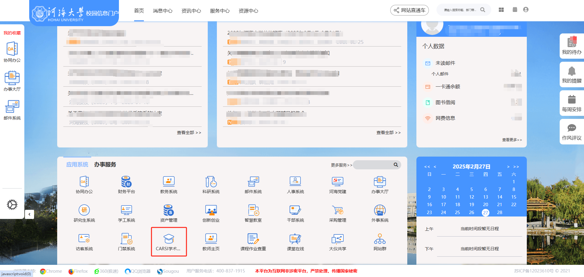 登录信息门户https://my.hhu.edu.cn,输入用户名和密码,点击登录,进入门户,在“应用系统”中选择“CARSI学术资源”,即可跳转至CARSI访问各类学术资源。
