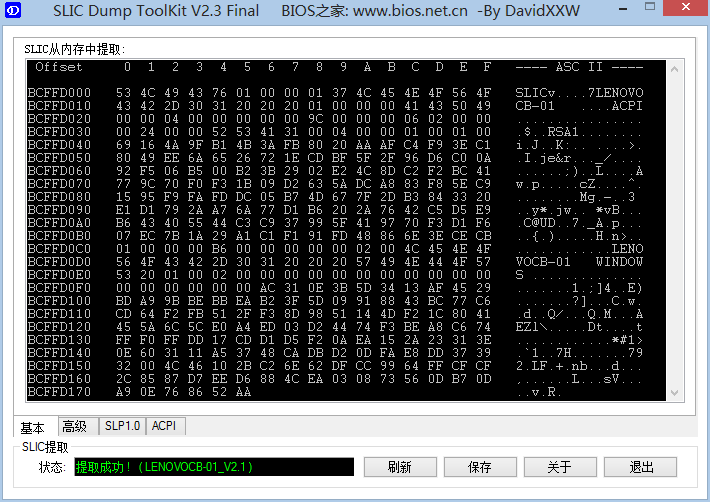 3.重启后,用SLIC DUMP ToolKIT检测(也需要管理员身份运行),在状态栏显示“提取成功”,说明安装成功,可以按照正常步骤进行激活。