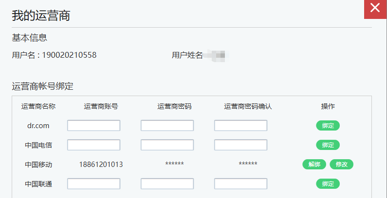 ②使用学/工号登录自助服务系统(http://zfw.hhu.edu.cn),点击”我的运营商”, 输入上网账号,并点击绑定(不再使用时点击对应运营商的解绑)。