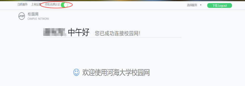 注:为便捷师生,不限时套餐用户登录成功后,点击最上方 “本机无感认证”,一个月内无需重复登录;如需关闭,可在校园网自助服务系统(zfw.hhu.edu.cn)“我的设备”中取消相应终端的无感认证。无感认证过程中建议使用设备MAC。