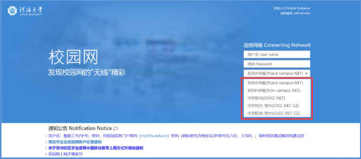 步骤2:在浏览器地址栏内输入http://zfw.hhu.edu.cnhttp://self-service.hhu.edu.cn,打开“校园网自助服务”页面。