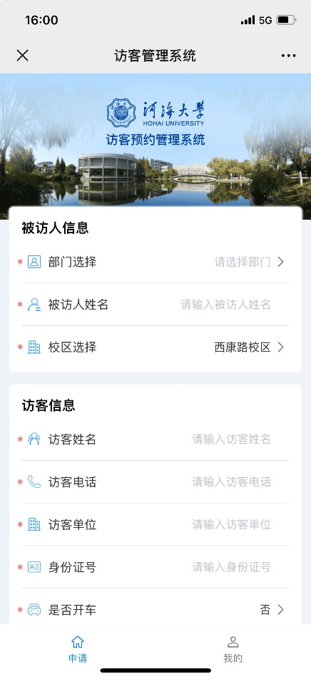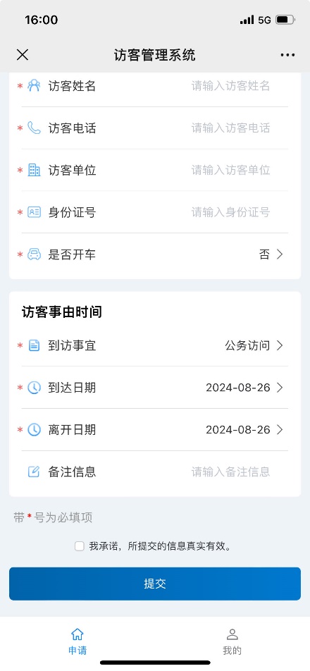②填写完整的被访人信息、访客信息及访问事由时间,提交申请。