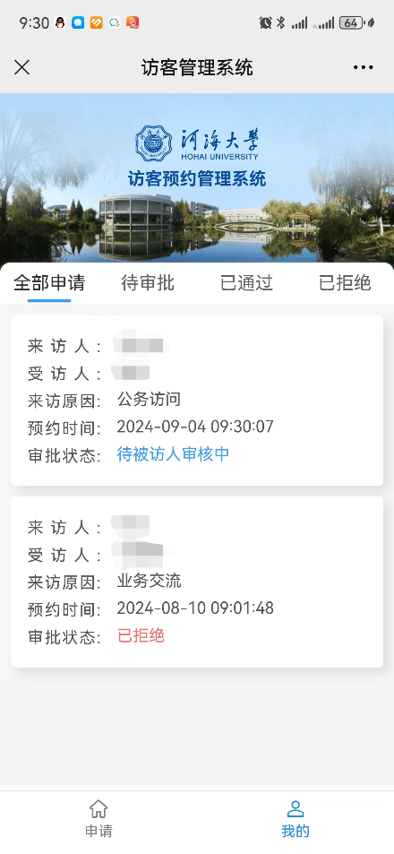申请提交后,等待被访人审批。审批通过后,点击“我的”查看访客码。