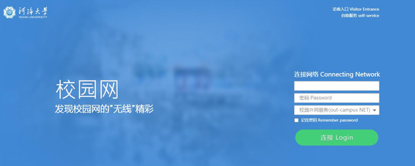 使用网线将电脑接入房间内的网络接入面板,或无线信号连接Hohai University,在浏览器地址栏内输入任一网址,弹出认证页面。在认证页面上输入学号和对应密码,下拉选择“中国移动”服务,点击“连接”。