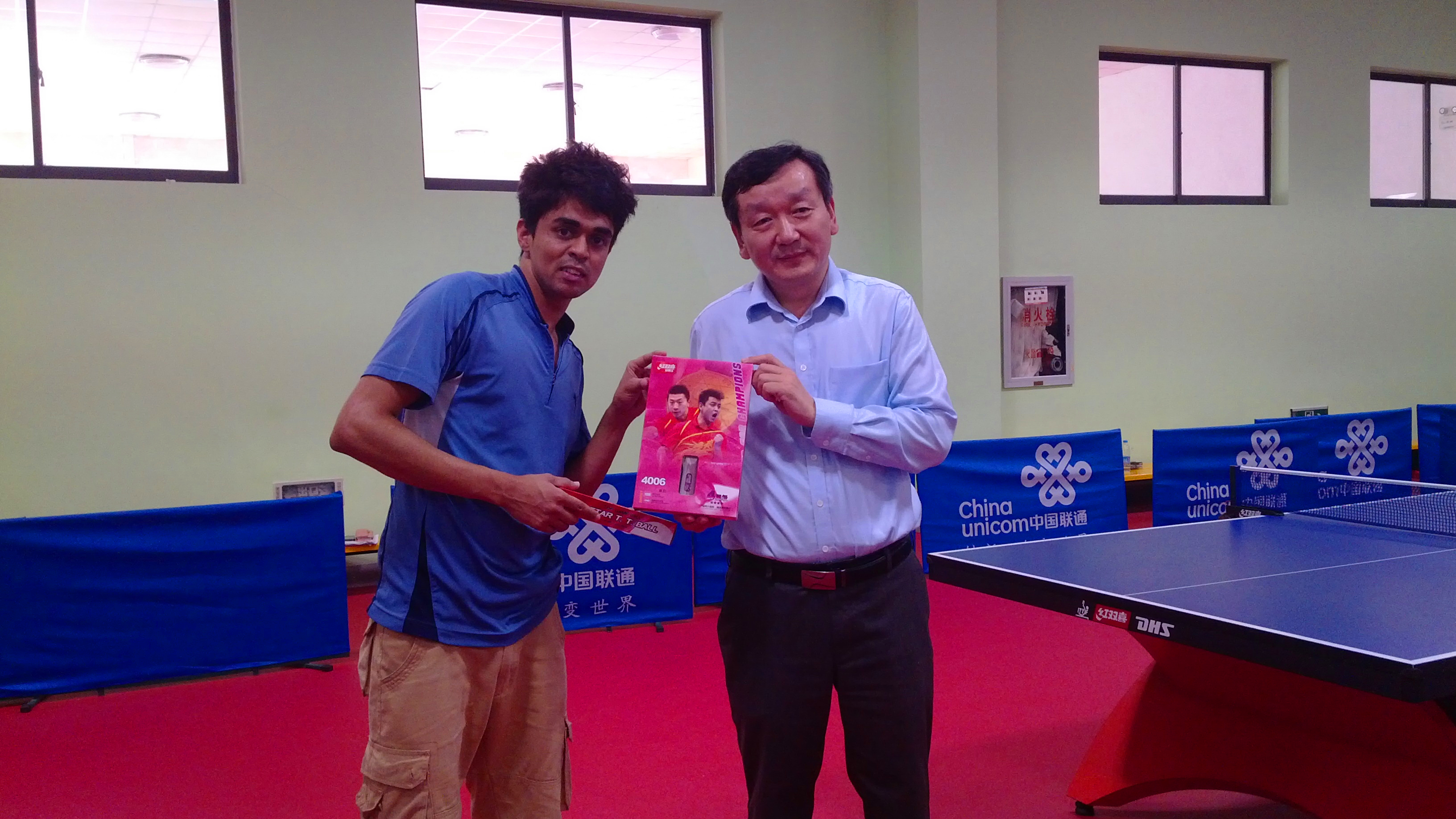 男乒决赛中,尼泊尔籍水利水电工程专业硕士研究生王亚杰(GAUTAM, RAJAN)以总比分3:1获得冠军,亚军是加纳籍环境工程专业硕士研究生代思莫(ANIM, DESMOND OFOSU)。女乒决赛中,越南籍港航专业博士研究生裴氏陲媛(BUI, THI THUY DUYEN)以总比分3:0获得冠军,亚军是吉尔吉斯斯坦籍工商管理专业硕士研究生萨比娜(ZHYRGALBEKOVA, SABINA)。国际教育学院张海军书记为参赛队员颁发纪念奖品。