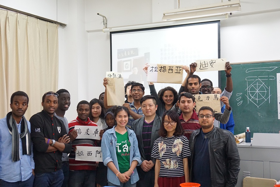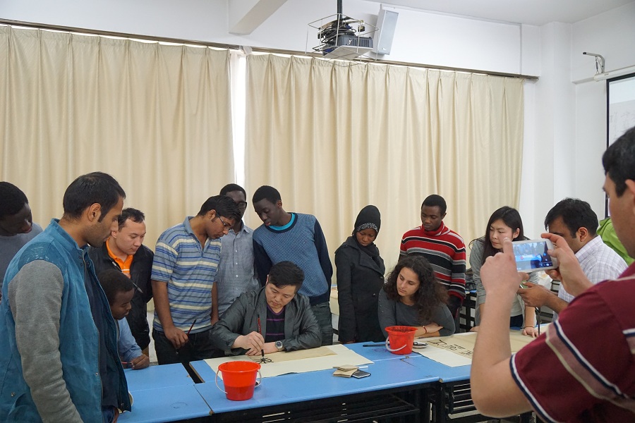 420日下午,我院举办了一场别开生面的书法讲堂,也是我院的中华文化精粹系列讲座之三。我院荣幸请到了青奥会书法大使、江左文化艺术中心校长伍根元来给留学生讲授书法课。伍校长介绍了中国书法的演变过程,并教学生握笔方法、正确坐姿以及横竖等基本笔法。学生对此非常感兴趣,并临摹起自己的名字。讲座结束时伍校长点评了本次的教学成果,他认为我校学生领悟能力很高,学习能力强,并赞扬了他们学习中华文化的热情。本次讲座取得了良好的效果。据悉,我院还将进一步为学生开拓系列文化活动,丰富留学生的文化生活。