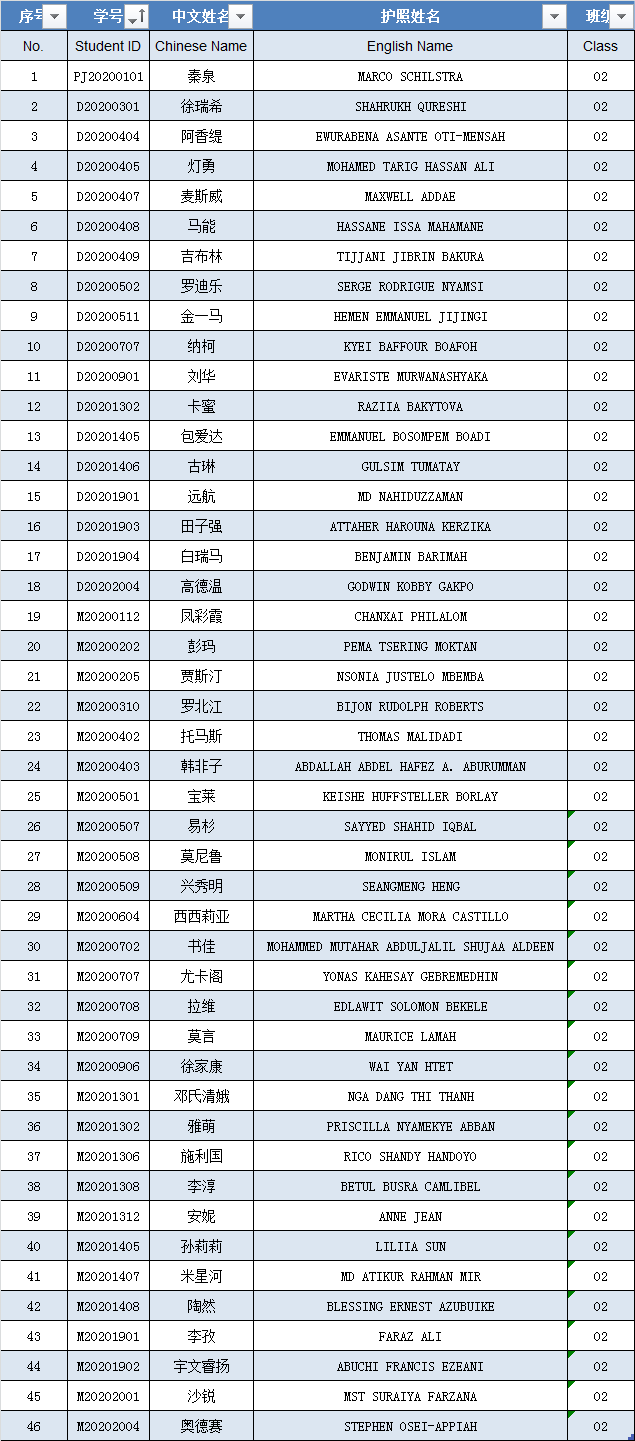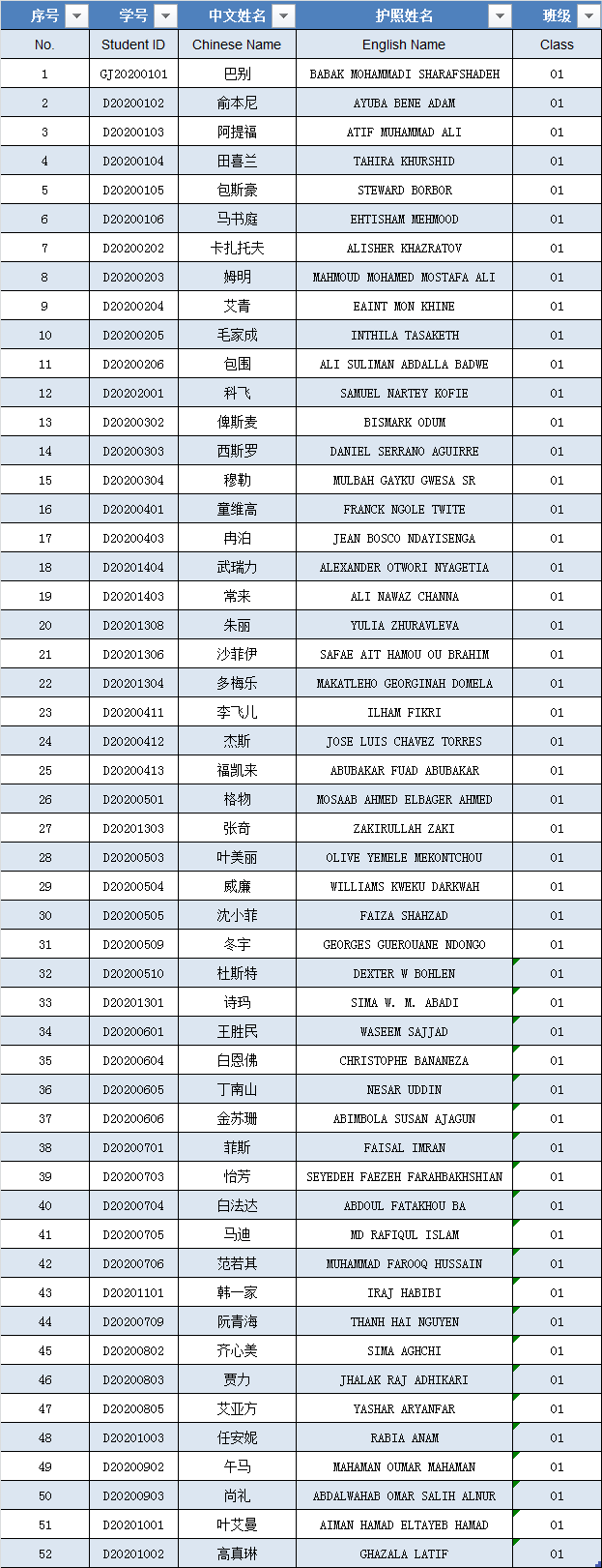 1) Class 01 refers to Chinese Language (2015LXS01-01) and Introduction to China (2015LXS03-01), including the doctoral students of 2020.