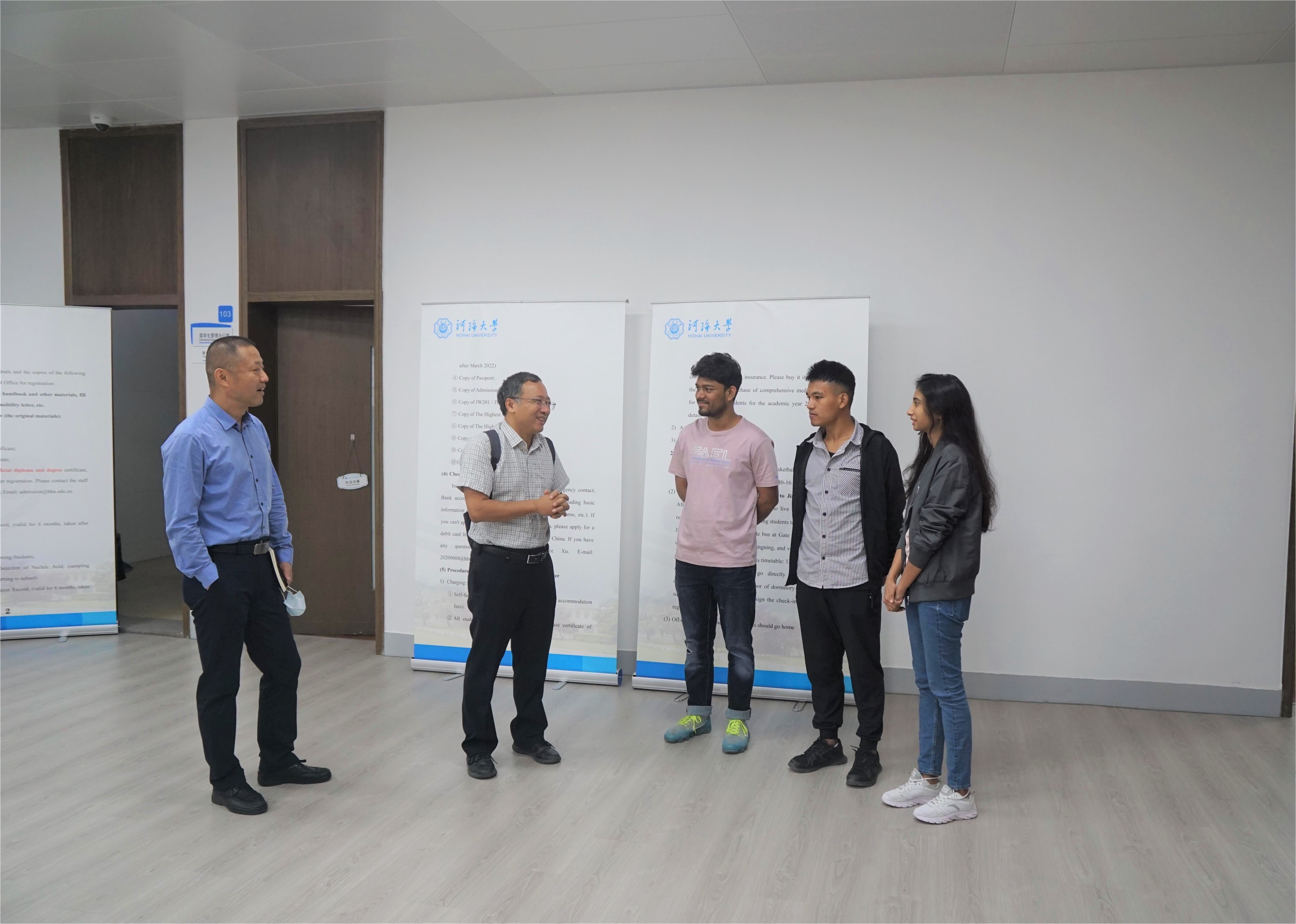 9月21日,澜湄水资源合作中心郝钊主任、交流处高立洪处长、培训处程东升处长一行看望慰问我校在校留学生代表。学院陈红胜院长,任海莹书记等相关人员陪同。