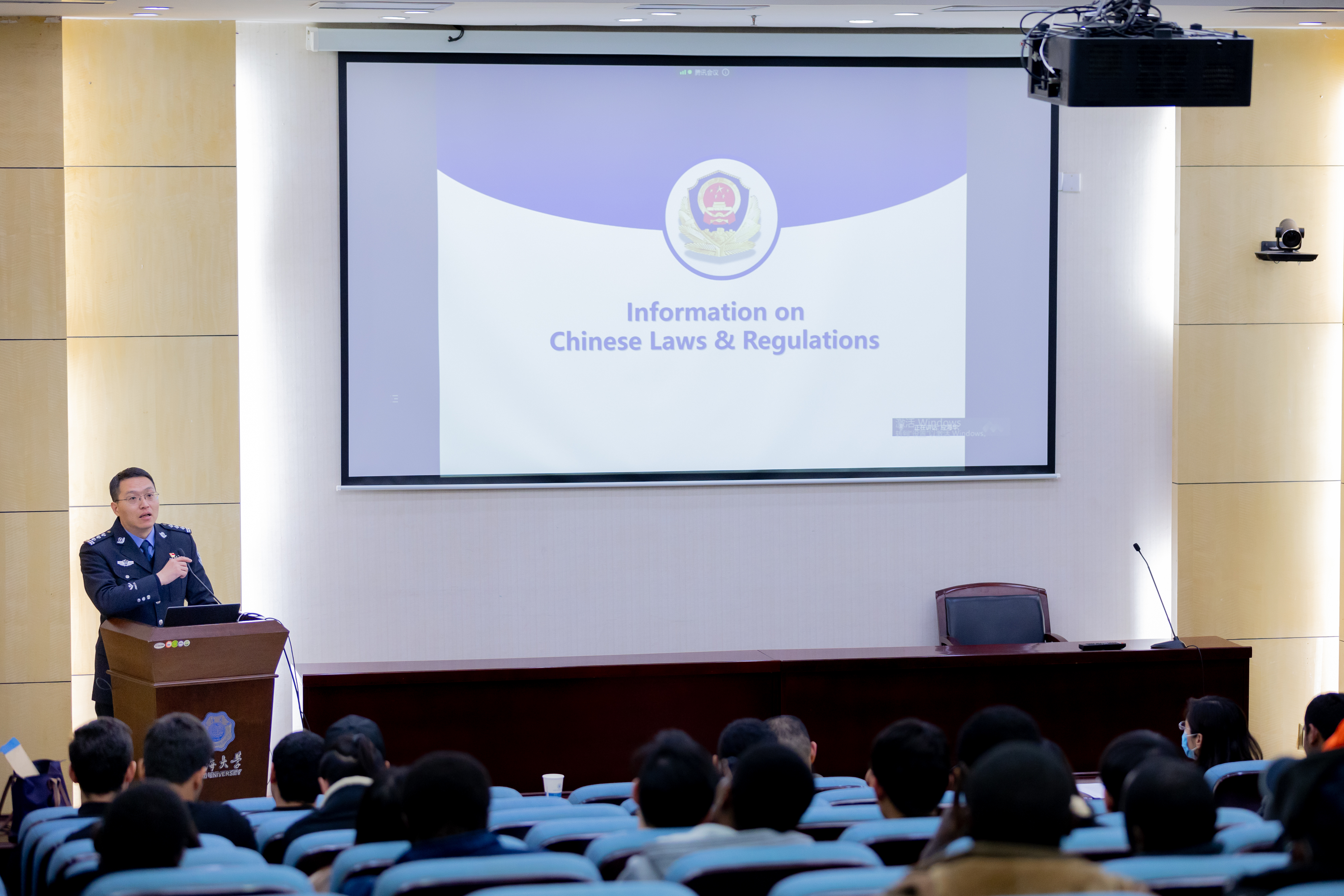 祝军警官与王晨星警官围绕《中华人民共和国宪法》、《中华人民共和国外国人入境出境管理办法》、《中华人民共和国境内外国人宗教活动管理规定实施细则》三大法律,结合生动的案例,详细介绍了非法入境、非法居留、非法就业、交通违法、电信诈骗、新型毒品、宗教管理等法律知识,要求全体留学生严格遵守中国的法律法规,做到平安留学、文明留学、成功留学。