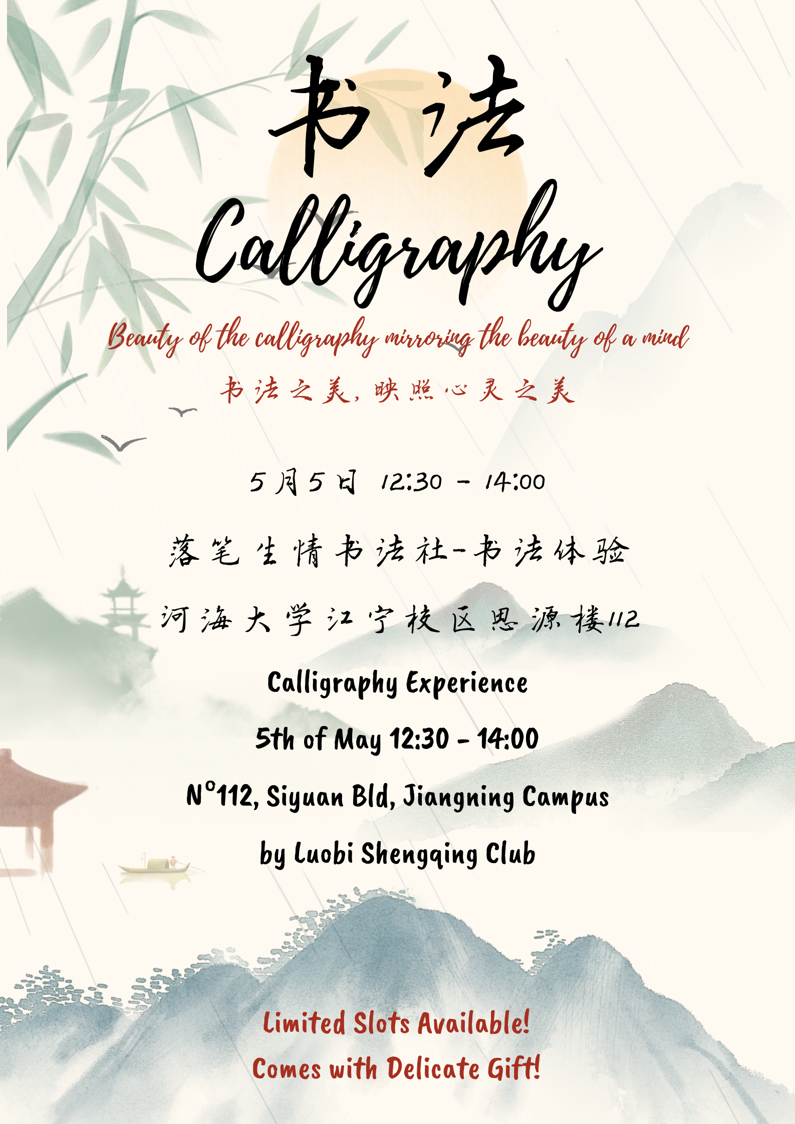 活动简介:本次书法体验活动,书法社将带领留学生认知中国书法构成的要素和书写工具,了解中国书法发展史,欣赏国际舞台上的中国书法元素等。社员们将现场指导书写,帮助留学生利用热缩片制作书法工艺品留作纪念。