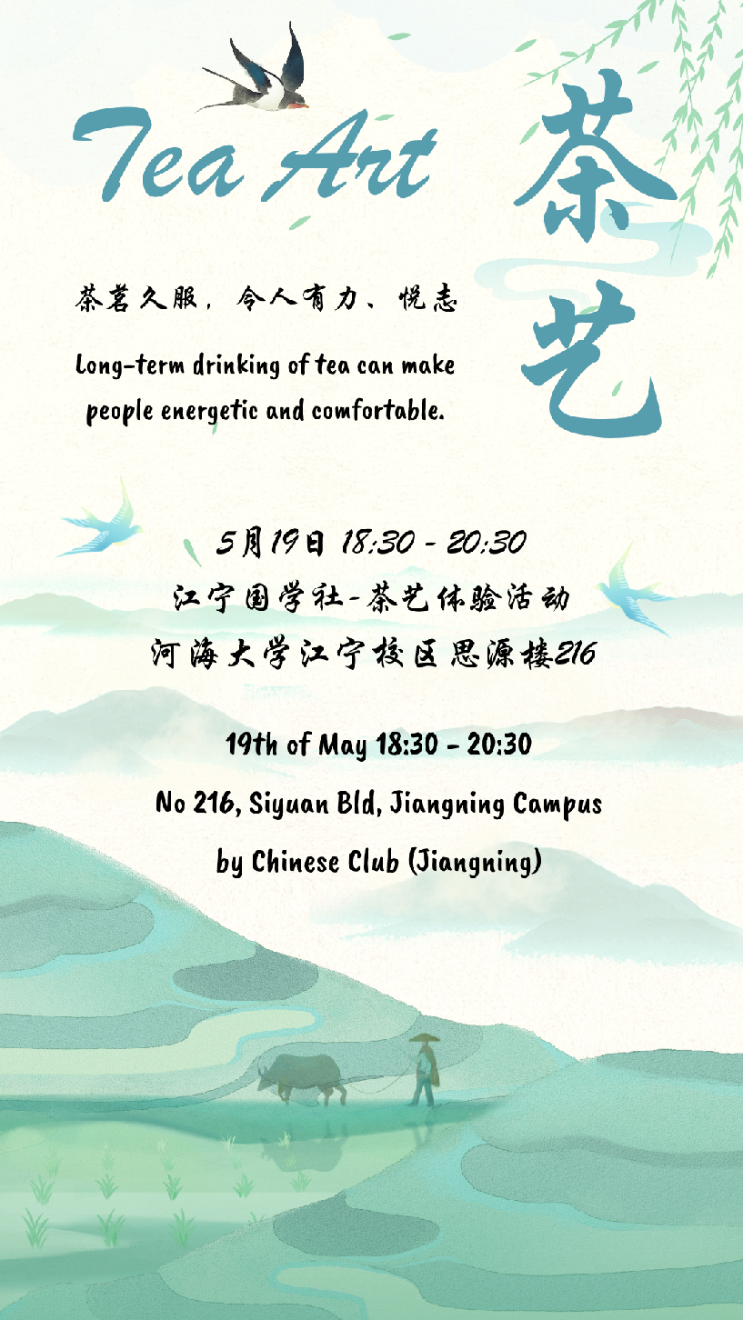 活动简介:江宁国学社以“弘扬传统文化,传承民族精神”为己任,以“为天地立心,为生民立命,为往圣继绝学,为万世开太平”为社团精神,定期开展知行读书、德音雅乐、清风太极、沁墨书法等主题活动。本次茶艺体验活动,国学社将向留学生介绍中国茶的基础知识,现场演示如何泡茶。留学生有机会一同品鉴茶水,在社员的指导下亲身体验烹茶。活动过程中,有很多互动游戏,参与者均可获得礼品。