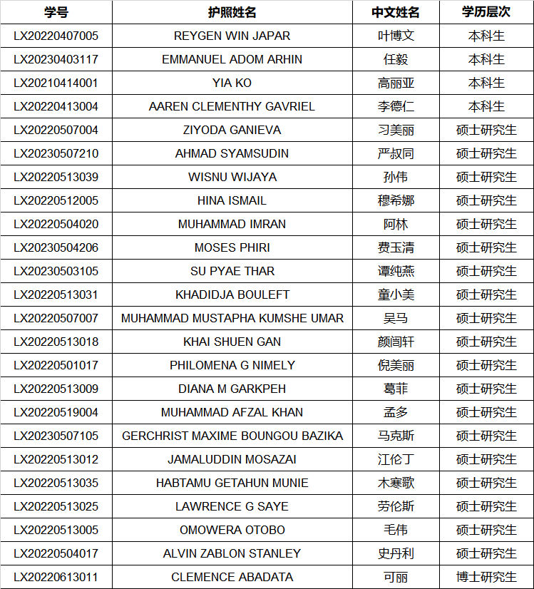 2024年度南京市政府奖学金外国留学生奖学金候补名单