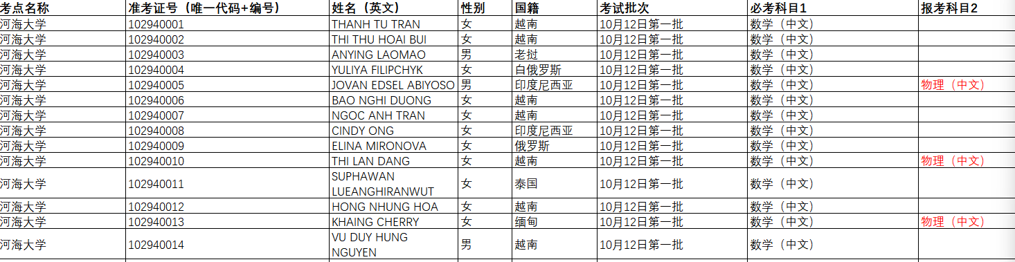 Attachment: Below are the numbers and information of the students participating in this exam: