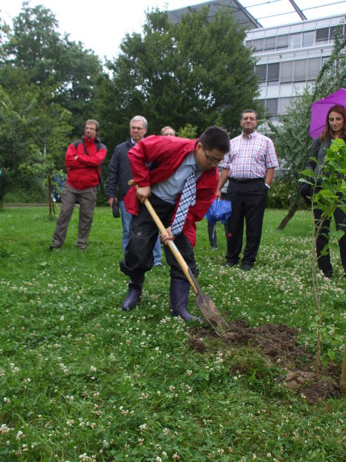 按照哈根大学的传统,每一位毕业的博士需要在研究所前种下一棵树,以作纪念。因此,我的照片正是我在博士答辩结束后,自己栽下的一棵桑树。