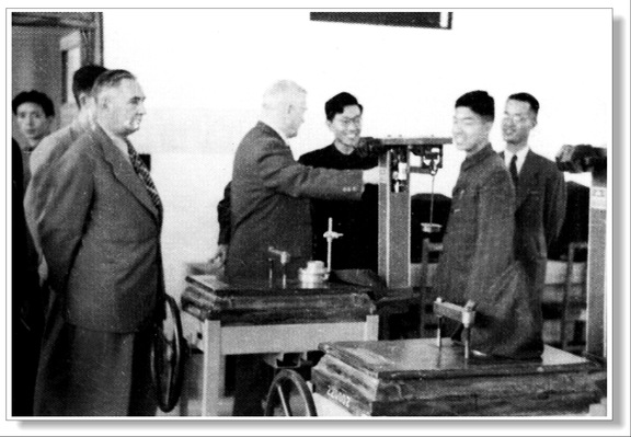 苏联专家参观钱家欢(右二)负责的华东水利学院土力学实验室