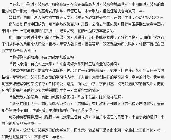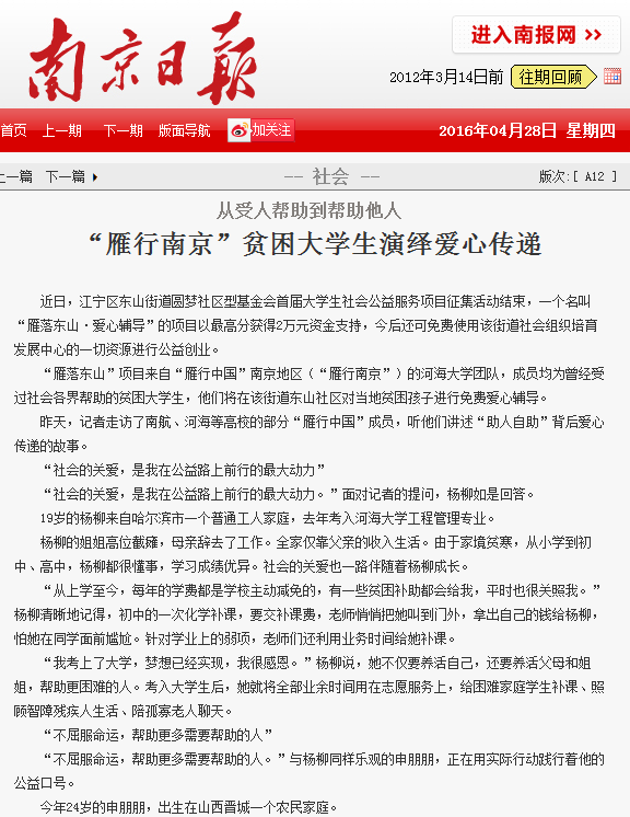 4月28日,《南京日报》A12版刊登了《从受人帮助到帮助他人,“雁行南京”贫困大学生演绎爱心传递》署名文章,对此进行了报道,赞扬了我校学子传递爱心、关爱社会、服务社会的崇高精神。