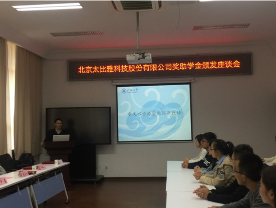 2017年10月19日,2016-2017学年“太比雅”奖助学金颁奖典礼暨座谈会在工程馆303会议室举行,北京太比雅科技股份有限公司创始人刘炳义,公司总经理唐宗仁,公司副总经理卢荡,公司总经理秘书郑晓燕,公司软件开发部副经理李海奔,开云电竞网水文水资源学院副院长(主持工作)杨涛,水文院、环境院年级辅导员以及获奖学生代表出席了此次会议,会议由开云电竞网水文水资源学院团委书记、2017级辅导员张力力老师主持。