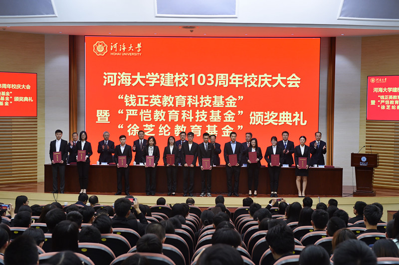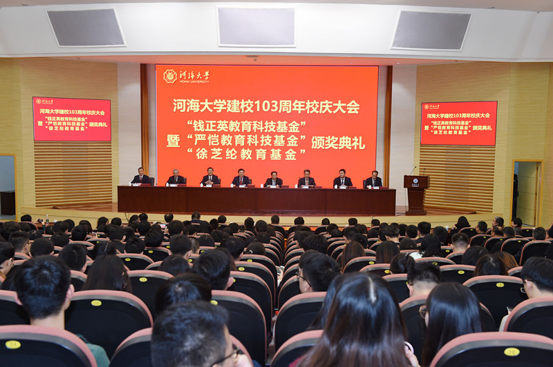 10月27日,我校举行建校103周年校庆大会暨钱正英教育科技基金、严恺教育科技基金和徐芝纶教育基金颁奖典礼。校党委书记唐洪武、校长徐辉、副校长徐卫亚、党委副书记郭继超、总会计师张兵、副校长许峰、副校长董增川、副校长郑金海出席大会。大会由唐洪武书记主持。
