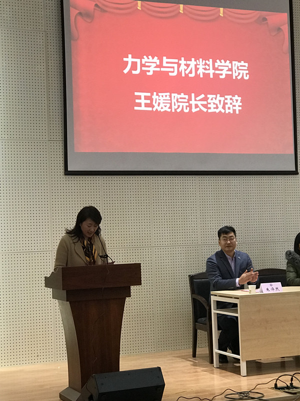 力学与材料学院院长王媛代表学院致辞,感谢上海欣美雅节能环境科技有限公司在学院设立奖助学金,帮助更多的学生实现自己的梦想,她表示学院将与上海欣美雅节能环境科技有限公司进一步加强合作,继续深化落实资助育人的教育理念,探索资助育人的新方式,为追逐梦想的贫困学生加油助力,激励每一位力学与材料学院的学子努力学习、为国争光。