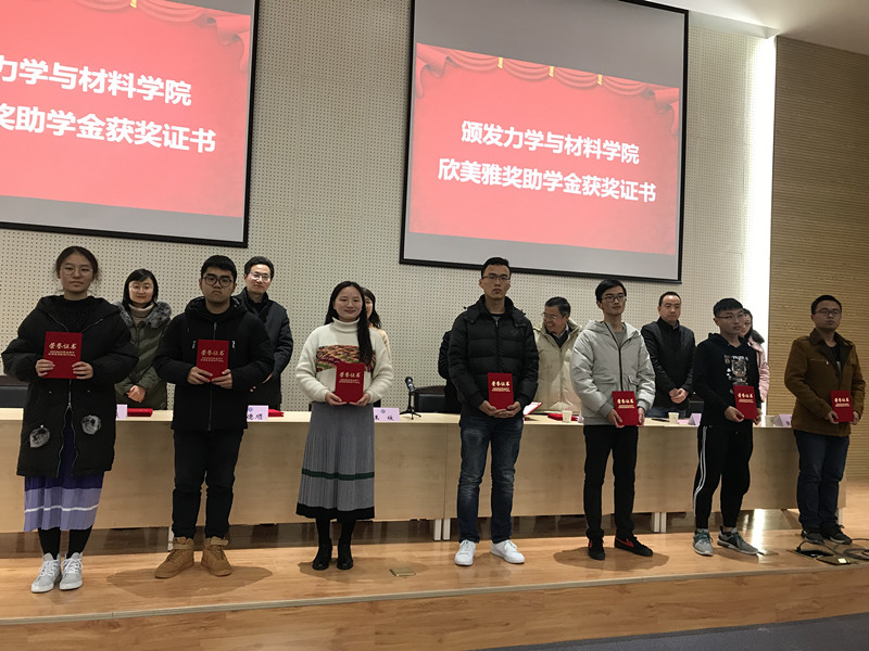2018年12月28日,我校2018年度“欣美雅”奖助学金颁奖典礼在力学与材料学院举行。上海欣美雅节能环境科技有限公司董事长樊宝平、力学与材料学院长院王媛、副院长蒋林华、殷德顺、黄丹出席颁奖典礼。