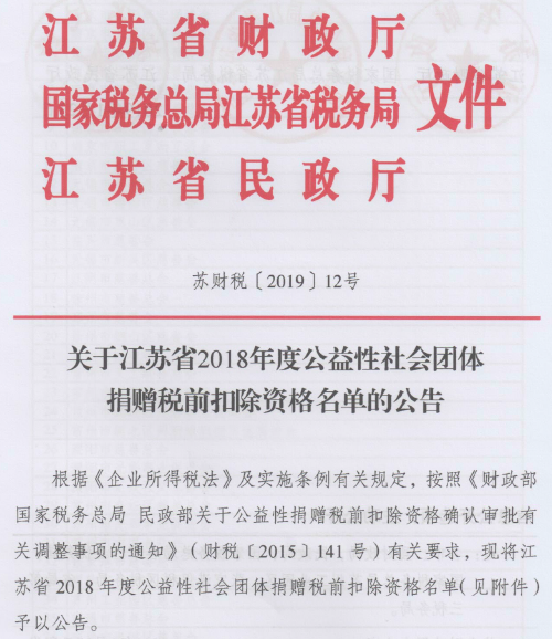 近日,江苏省财政局、国家税务总局江苏省税务局、江苏省民政厅发文公布了江苏省2018年度公益性社会团体捐赠税前扣除资格名单(《关于江苏省2018年度公益性社会团体捐赠税前扣除资格名单的公告》苏财税[2019]12号)。