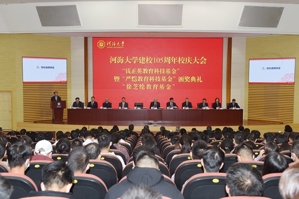 徐辉校长在讲话中指出,河海精神百年传承、延绵至今,“治水救国、治水报国、治水强国”接续的文化脉络,构筑起河海人共同的精神家园,成为学校生存发展的血脉根基。他表示,在105年的发展历程中,河海人肩负“治水兴邦”的使命担当,坚守“毋负邦人期”的价值追求,艰苦创业、砥砺奋进,始终把成果书写在祖国大地上、应用在中国特色社会主义事业的伟大实践中。站在两个一百年奋斗目标的历史交汇点上,我们要以习近平新时代中国特色社会主义思想为指引,坚持立德树人根本任务毫不动摇,在服务国家战略中彰显办学特色,坚持体制机制改革提升治理水平,在传承创新中大力弘扬河海精神,以新时代奋进之笔,书写学校新百年发展的得意之作。