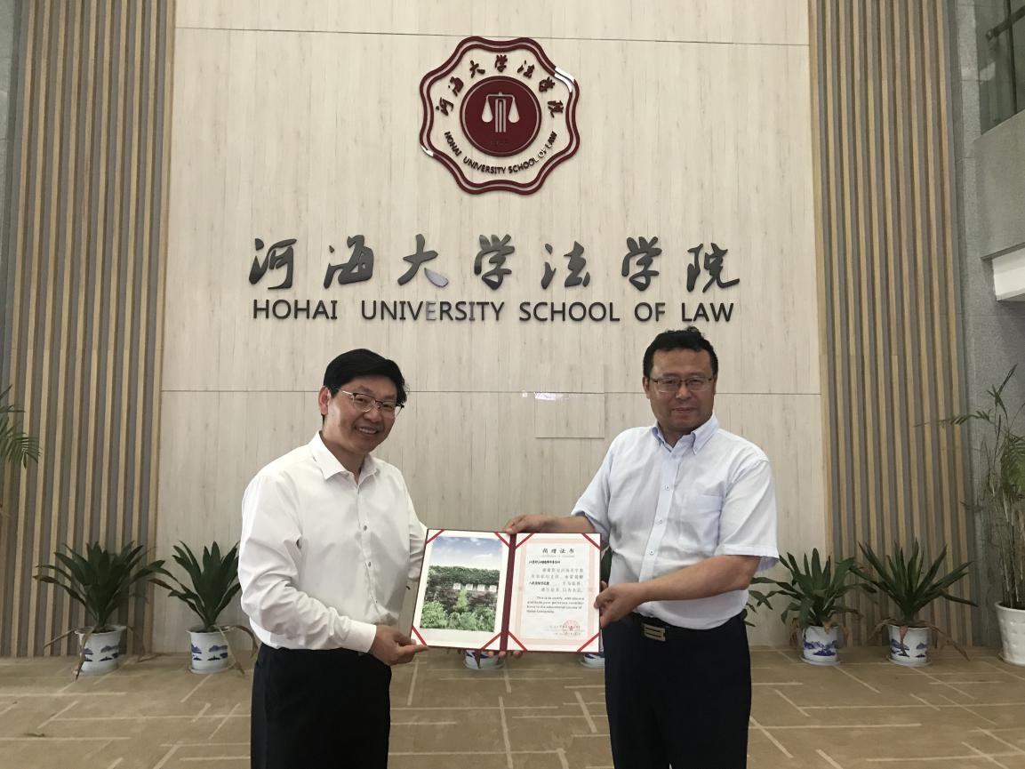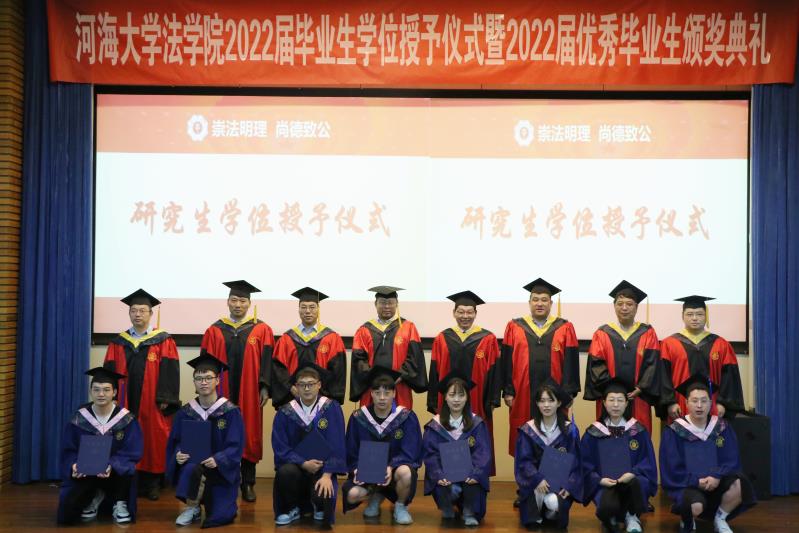 颁奖典礼上,韩旗、栾云根和刘惠明为获奖学生颁发荣誉证书,并受邀与法学院领导、教师代表一同向毕业生授予学位证书。韩旗作为捐赠单位代表,他说能够见证同学们这一人生中的重要时刻,他感到非常荣幸和激动,并为同学们送上“爱国、爱校、爱自己”的真挚祝福和期盼。栾云根作为校友代表,希望河海法科学子对未来充满信心,毕业后时刻心系母校,心系社会,贡献自己的一份力量。